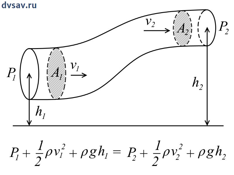 Вывод уравнения Бернулли следует из уравнения непрерывности текущей жидкости и закона сохранения энергии. Этот вывод можно найти в [Джанколи]. Здесь приведу только рисунок, иллюстрирующий вывод.