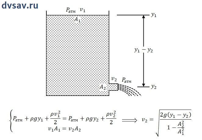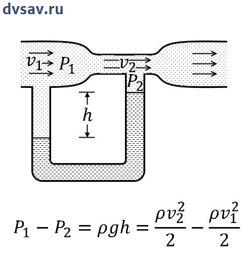 Примеры использования уравнения Бернулли, приведенные в учебниках, разделились для меня на понятные и непонятные. Сначала приведу два понятных мне примера, затем — два непонятных. Наверное стоит оговориться, что вязкостью жидкости при рассмотрении закона Бернулли в учебниках для простоты пренебрегают.