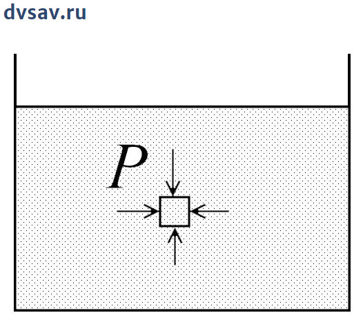 В книге [Джанколи] определение давления в жидкости дается в разделе 12.2 Давление в жидкостях и газах как модуля силы, которая действует на единицу площади грани очень малого кубика, наполненного той же жидкостью (рис. 2). Причем определение дается принципиально для покоящейся жидкости, следовательно и кубик тоже покоится. А раз кубик покоится, то значит сила, действующая на его левую грань, равна по модулю силе, которая действует на его правую грань. А сила, действующая на его верхнюю грань, равна по модулю силе, действующей на его нижнюю грань. Кроме того, утверждается, что давление одинаково во всех направлениях, то есть например сила, действующая на левую грань, равна по модулю силе, действующей на нижнюю грань (это опытный факт, который называется законом Паскаля).