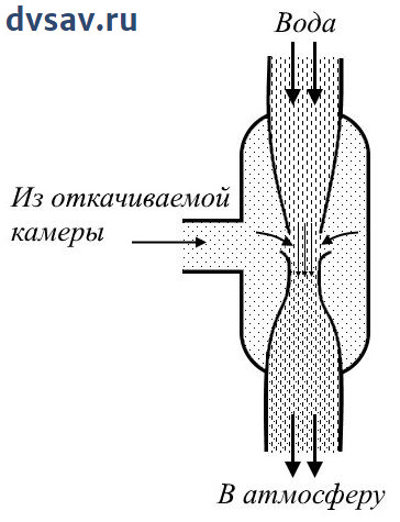 Другой непонятный для меня пример — водоструйный насос (рис. 10), который приводится в качестве примера в [Савельев]. Это трубка Вентури, через которую течет жидкость. Причем конец трубки выходит в атмосферу. В сужении трубки создается давление ниже атмосферного, что позволяет ей засасывать воздух из откачиваемой камеры.