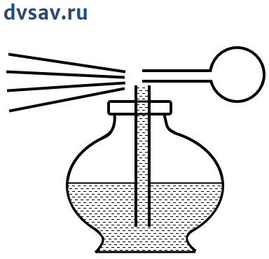 В [Джанколи] в качестве примера использования закона Бернулли приводится пульверизатор (рис. 9). Имеется сосуд с жидкостью, в который опущена трубка. Над трубкой расположена груша, при помощи которой можно выдувать воздух, и струя этого воздуха будет проходить над трубкой, опущенной в жидкость. Утверждается, что давление в струе воздуха будет ниже атмосферного, так струя воздуха движется с большой скоростью. Поэтому жидкость будет выталкиваться атмосферным давлением через трубку наружу и захватываться струей воздуха.
