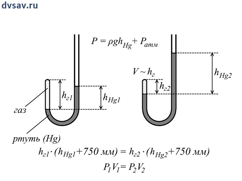 Уравнение состояния идеального газа получено из обобщения трех экспериментальных закономерностей. Все эти закономерности, как я подозреваю, можно получить при помощи одного и того же устройства — J-образной трубки, закрытой с одного конца и открытой с другого (см. рис. 1). В закрытом конце трубки заперт газ. Газ заперт при помощи столба ртути. Давление газа, если измерять его в мм. рт. ст., равно разности высот столбиков ртути в закрытом и открытом концах плюс атмосферное давление, равное как известно 750 мм. рт. ст. Перепад высот столбика ртути можно регулировать, изменяя таким образом давление и/или объем газа. И наконец, газ можно нагревать, т. е. изменять его температуру.