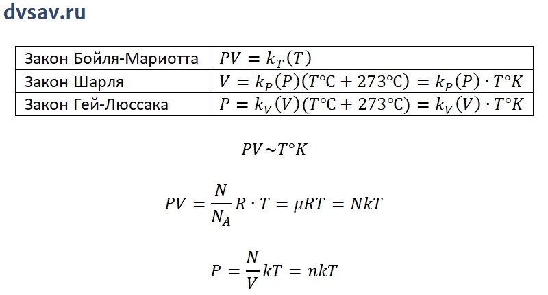 Уравнение состояния идеального газа вместе с тремя газовыми законами представлено на рис. 2. Здесь NA — число Авогадро (число молекул в одном моле вещества), R — универсальная газовая постоянная, k — постоянная Больцмана, n — число молей в объеме газа.