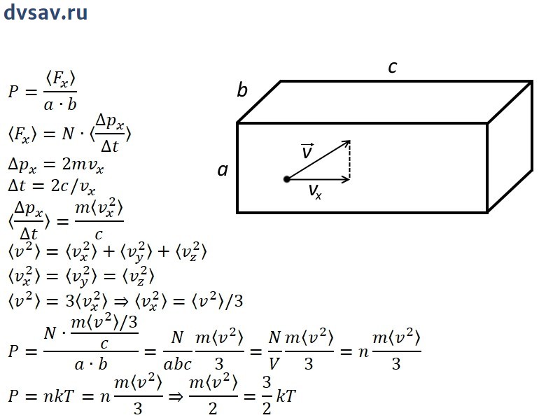 В 1860-х гг. Джеймс Клерк Максвелл и Людвиг Больцман развили теорию — молекулярно-кинетическую теорию — которая позволила интерпретировать температуру как меру средней кинетической энергии поступательного движения молекул газа. Соответствующие математические выкладки представлены на рис. 3. Интересно, что температура почему-то отражает энергию именно поступательного движения молекул газа, и не отражает энергию их вращательного и/или колебательного движения.