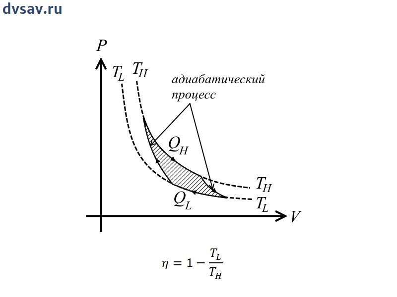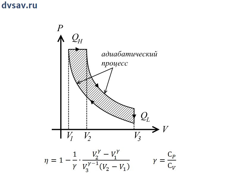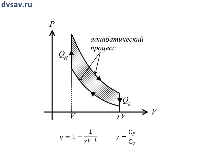 В бензиновом двигателе внутреннего сгорания цикл (который называется циклом Отто в честь изобретателя этого двигателя) начинается с того, что сжатые пары бензина воспламеняются искрой от свечи зажигания, что приводит к резкому скачку давления и температуры при постоянном объеме (здесь система получает количество теплоты QH; теплота получается из химической энергии, которая высвобождается в реакции горения). Затем газ начинает расширяться адиабатически, и расширяясь, он производит работу, тратя на это свою внутреннюю энергию и поэтому охлаждаясь. Затем он уходит из двигателя в атмосферу через выпускной клапан (там в атмосфере газ охладится до температуры атмосферы). Затем через впускной клапан в двигатель снова засасываются пары бензина, после чего они сжимаются адиабатически (т. е. поршень двигателя совершает над газом механическую работу, которая идет целиком на увеличение внутренней энергии газа, из-за чего газ нагревается) и цикл повторяется снова. Т. е. получается, что на последнем этапе цикла горячие выхлопные газы заменяются холодными парами бензина (таким образом, здесь система отдает в атмосферу количество теплоты QL). Ну и наконец надо сказать, что при расширении газ совершает большую работу, чем поршень совершает над ним при сжатии, потому что расширяется он при большем давлении (горячие выхлопные газы), а сжимается при меньшем (холодные пары бензина). Поэтому суммарная механическая работа, совершаемая газом оказывается больше нуля.