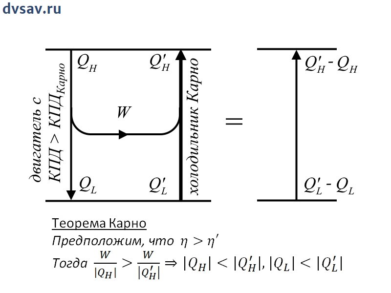 Теорема Карно говорит о том, что не существует в природе двигателя, работающего между двумя термостатами и имеющего более высокий КПД, чем двигатель Карно, работающий между теми же двумя термостатами (см. [Джанколи, раздел 21.5]). Теорема доказывается от противного. Пусть существует двигатель с КПД большим, чем у двигателя Карно. Цикл Карно — это обратимый цикл, поэтому его можно… обратить, т. е. превратить двигатель Карно в холодильник. Соединив (см. рис. 5) этот холодильник и двигатель с КПД большим, чем у двигателя Карно, получим идеальный холодильник — т. е. такой, который отбирает тепло у холодного термостата и отдает горячему, не затрачивая никакой механической работы, что противоречит 2-му началу термодинамики в формулировке Клаузиуса.
