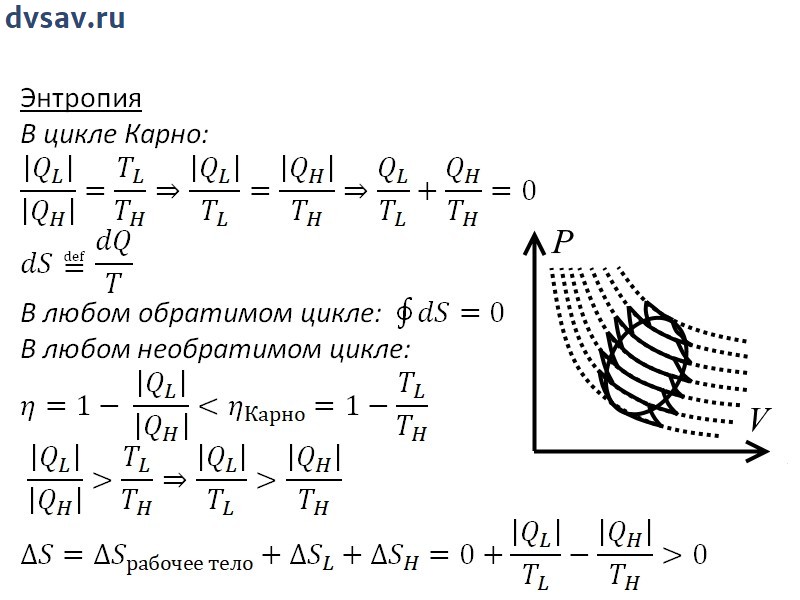 Понятие энтропии было введено Клаузиусом. Определение энтропии показано на рис. 6. Это физическая величина такая, что ее приращение равно приращению теплоты, деленное на температуру (по шкале Кельвина). Для любого обратимого цикла приращение энтропии равно нулю. Доказывается это путем накрывания PV-диаграммы такого цикла бесконечно большим количеством бесконечно малых циклов Карно (для каждого цикла Карно приращение энтропии равно нулю). Теперь, поскольку КПД любого реального двигателя меньше, чем КПД двигателя Карно, доказывается, что приращение энтропии для любого реального двигателя больше нуля (причем, учитывается суммарная энтропия рабочего тела и термостатов, между которыми работает двигатель). Это так называемая общая формулировка 2-го начала: энтропия любо замкнутой системы не может убывать.