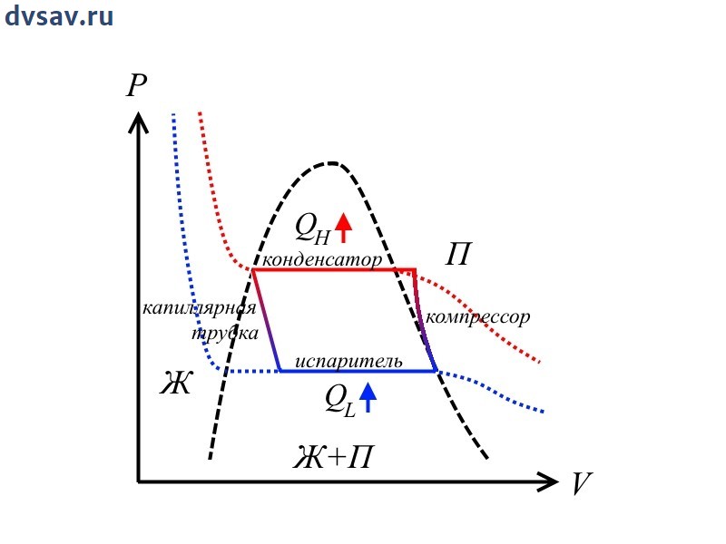 На рисунке 4 показана PV-диаграмма цикла холодильника. Бытовой холодильник состоит из четырех частей, по которым циркулирует теплоноситель: