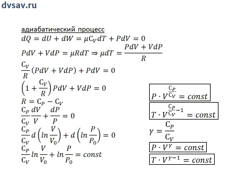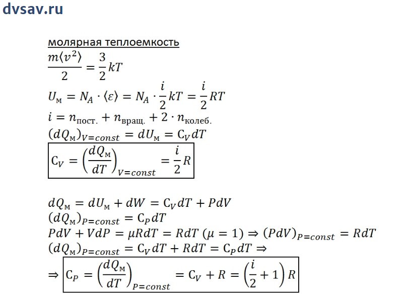 Первые три процесса просто описываются уравнением идеального газа. А вот для адиабатического процесса написать уравнение сложнее. Для этого удобно ввести понятия молярной теплоемкости. Молярная теплоемкость — это количество теплоты, которое необходимо передать одному молю газа, чтобы нагреть его на один градус Кельвина. Вообще понятие теплоемкости очень важно, поскольку оно связывает получаемую системой теплоту с параметрами состояния этой системы. Различают молярную теплоемкость при постоянном давлении и при постоянном объеме. Ниже приведены выкладки для вычисления этих теплоемкостей.