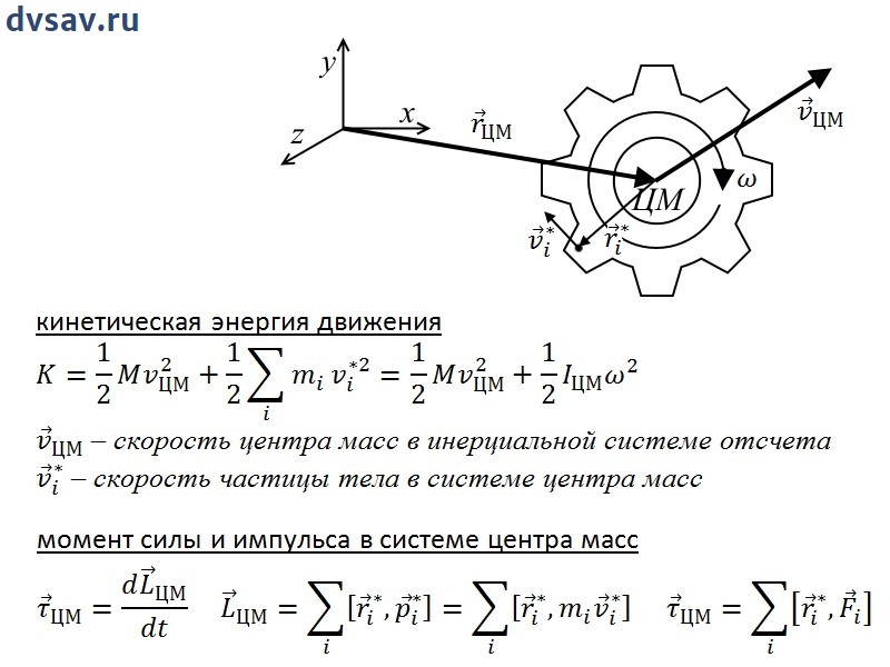 Произвольное движение тела можно описать как поступательное движение его центра масс плюс вращение вокруг оси, проходящей через центр масс. Оговоримся, что поступательное движение центра масс вовсе не обязано быть равномерным так же как ось вращения, проходящая через центр масс не обязана сохранять свое направление неизменным. Кинетическая энергия движения равна сумме кинетической энергии центра масс и кинетической энергии вращения вокруг оси, проходящей через центр масс. Что понимается под обеими энергиями — показано на рисунке 5.