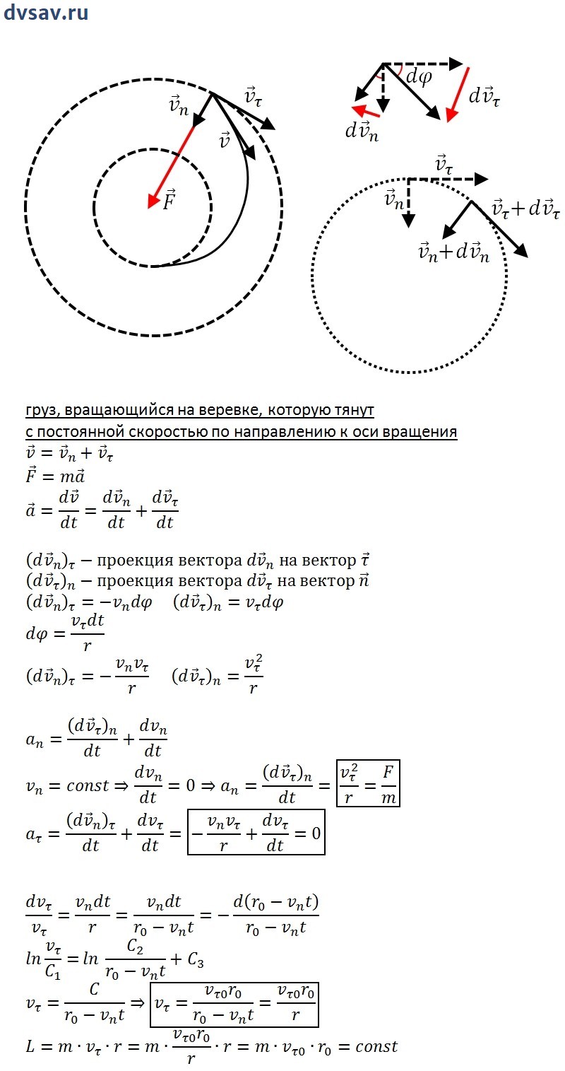 В учебниках в качестве примера действия закона сохранения момента импульса приводят вращающегося на льду фигуриста. На фигуриста не действует момент сил, поэтому его момент импульса не меняется. Однако фигурист может изменить угловую скорость своего вращения прижимая руки к корпусу или наоборот вытягивая их в стороны, т. е. изменяя свой момент инерции. И если с математической точки зрения тут все понятно, то с точки зрения интуиции… может быть и не очень. Раз угловая скорость повышается, то повышается тангенциальная скорость. Значит, казалось бы, на тело действует тангенциальное ускорение. Но откуда же ему взяться, если мы знаем, что никакой тангенциальной силы на тело не действует? Поэтому я решил рассмотреть эту задачу без привлечения понятия момента, используя только законы Ньютона. На рисунке 4 показана задачка вычисления зависимости скорости вращения груза на веревке, которую тянут по направлению к оси вращения. В задачке я выделяю два направления: нормальное (буква n) — к оси вращения и тангенциальное (буква тау) — по касательной к окружности, которая проходит через вращающийся груз и центр которой находится на оси вращения; эти два направления перпендикулярны друг другу. Так вот, оказывается, что хотя тангенциальная составляющая скорости груза и увеличивается по мере его приближения к оси вращения, это вовсе не означает, что существует ненулевая тангенциальная составляющая ускорения груза. Дело в том, что нормальная составляющая скорости — т. е. та скорость, с которой груз подтягивают к оси вращения, постоянно меняет свое направление, что означает наличие ускорения.