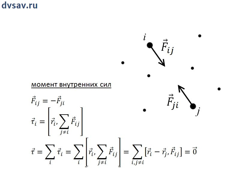 Почему вообще вводят понятие «момент силы», «момент импульса»? Разве для того, чтобы рассчитать движение системы тел, не хватает обычных законов Ньютона? Да, не хватает. Рассматривая систему из нескольких тел (материальных точек) все силы делят на внутренние и внешние по отношению к системе. Внутренние силы действуют между телами системы, а внешние действуют на тела системы со стороны других тел, в систему не входящих. Так вот: если величины внешних сил обычно известны, то величины внутренних сил обычно неизвестны. Введение понятия момента силы позволяет исключить внутренние силы из рассмотрения, поскольку момент внутренних сил обращается в ноль благодаря тому, что силы между двумя материальными точками действуют вдоль линии их соединяющей и тому, что векторное произведение коллинеарных векторов равно нулю (см. рис. 2). Остается лишь момент внешних сил, поэтому скорость изменения момента импульса системы материальных точек оказывается равной моменту внешних сил.