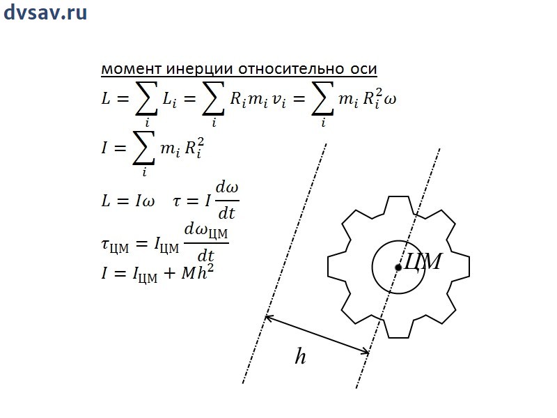 Если записать аналог 2-го закона Ньютона для тела, вращающегося вокруг оси (рис. 3), то становится очевидной аналогия между силой и моментом силы, скоростью и угловой скоростью, а также массой и некоей величиной, называемой моментом инерции. Насколько я понимаю, момент инерции задается только относительно оси, задавать момент инерции относительно точки бессмысленно. Причем момент инерции имеет смысл задавать относительно не любой оси, а именно той, вокруг которой тело вращается в данный момент. Момент инерции материальной точки относительно оси равен произведению массы этой точки на квадрат расстояния ее до оси. Проекция момента импульса тела на его мгновенную ось вращения равна произведению момента инерции на угловую скорость вращения. Соответственно проекция момента внешних сил на ось вращения равна произведению момента инерции на производную от угловой скорости по времени.