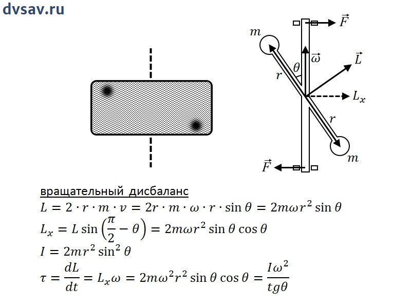 Неожиданным может показаться тот факт, что в общем случае момент импульса не сонаправлен с осью вращения. Яркий пример, иллюстрирующий это — дисбаланс колес автомобиля (рис. 6). Если ось вращения не совпадает с осью симметрии вращающегося тела (предполагаем, что тело однородно), то момент импульса сам будет вращаться вокруг оси вращения, а это значит, что будет существовать момент сил (тоже вращающийся). Откуда берется момент сил? Это силы реакции опор оси вращения. Эти силы будут приводить к разбалтыванию оси, особенно, если частота вращения колеса близка к резонансной частоте колебаний оси.