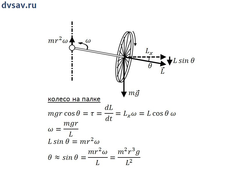 Еще одна вещь, связанная с вращением, которая может показаться загадочной — волчок. Он, как известно, крутится и до определенного момента не падает. По мере того, как вращение волчка замедляется из-за трения, становится заметным, что его ось меняет направление — вращается (это называется прецессией). Момент силы тяжести всегда перпендикулярен моменту импульса волчка, поэтому момент импульса волчка будет поворачиваться вокруг вертикальной оси. Сам волчок никогда не стоит строго вертикально, его ось наклонена, и угол наклона зависит от момента импульса волчка. Аналогичен случай вращающегося колеса на палке (рис. 7). Несмотря на действие силы тяжести, ось колеса не повисает вертикально вниз, а начинает прецессировать. Можно рассчитать и угловую скорость прецессии. Эти примеры приведены в [Джанколи, раздел 10.9].