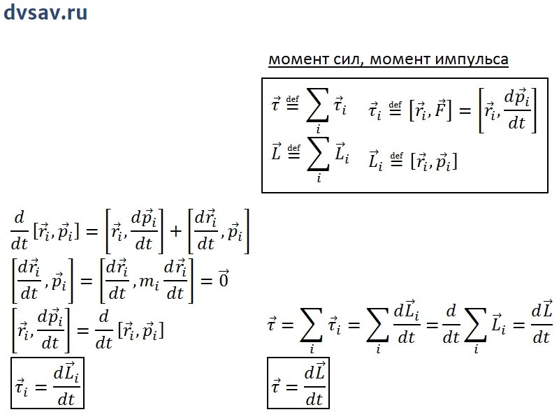 На рисунке 1 показано определение понятия «момент силы» (греческая буква тау) и «момент импульса» (буква L). Момент силы представляет собой векторное произведение силы, действующей на материальную точку, на радиус-вектор этой точки. Аналогично определяется момент импульса. Связь между моментом силы и моментом импульса мы найдем, если векторно умножим 2-й закон Ньютона для материальной точки на радиус-вектор этой точки.