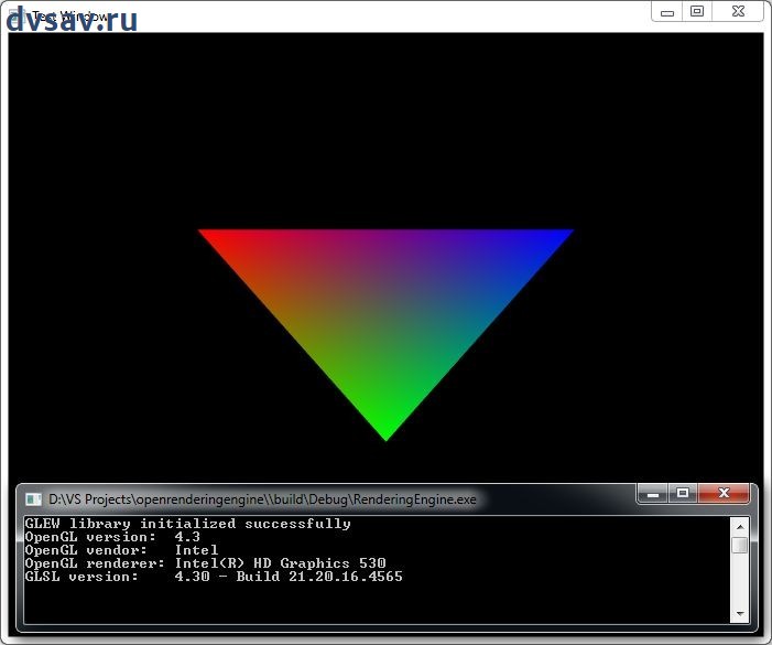 В следующей заметке начнем переписывать приведенную программу рисования треугольника, чтобы сделать ее проще и понятней. Делать это мы будем путем создания некоего набора классов, т. е. своего фреймворка, движка, API… или как вам будет угодно это называть.