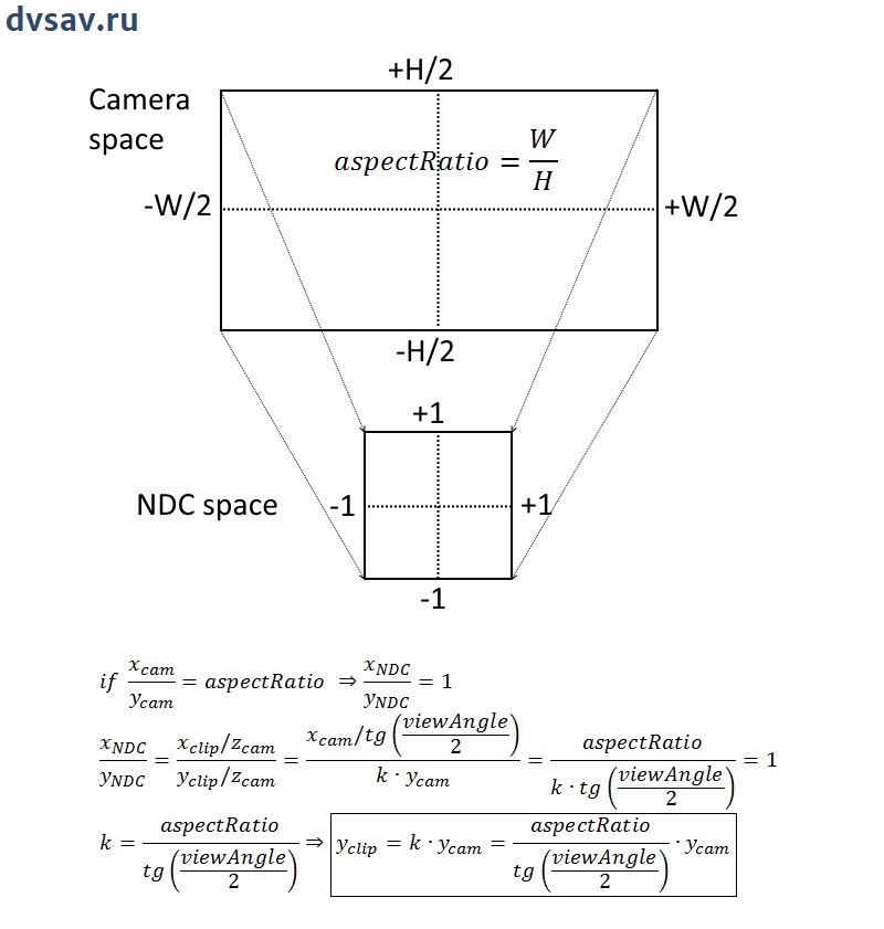 Ну и наконец, запишем окончательное выражение для общего случая для матрицы перспективной проекции с учетом угла обзора и соотношения сторон (рис. 6).