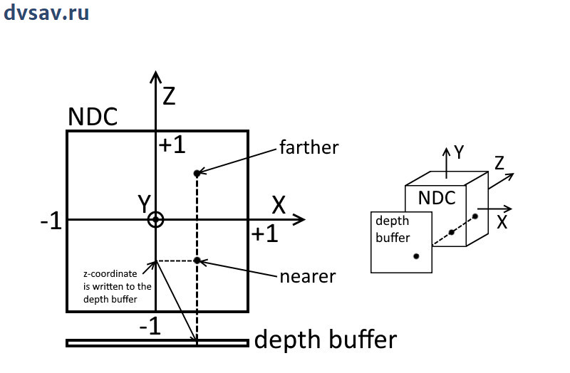 И последнее, о чем надо рассказать в контексте перспективной проекции. Предметы расположенные ближе к наблюдателю, кажутся ему больше тех, которые расположены дальше. А еще предметы, расположенные ближе, заслоняют предметы, расположенные дальше. И вот, чтобы реализовать данное явление, в компьютерной графике применяется технология под названием depth test. В прошлых заметка я упоминал о том, что есть несколько буферов памяти, в которых хранится информация об изображении — самый понятный из них — color buffer, который хранит цвета всех пикселей на экране. Но есть еще один буфер — буфер глубины (depth buffer). В него записывается Z-координата в NDC space для объектов (точнее — их пикселей, еще точнее — фрагментов (фрагмент — это то, что потенциально может стать пикселем)), ближайших к наблюдателю. Вот как это делается для нашего случая, когда ось Z направлена вглубь экрана (рис. 7): если фрагмент имеет координату Z меньшую, чем текущее значение в depth buffer, то эта координата записывается в depth buffer, а цвет фрагмента записывается в color buffer. Если фрагмент имеет координату Z большую, чем текущее значение в depth buffer, то этот фрагмент отбрасывается (discard).