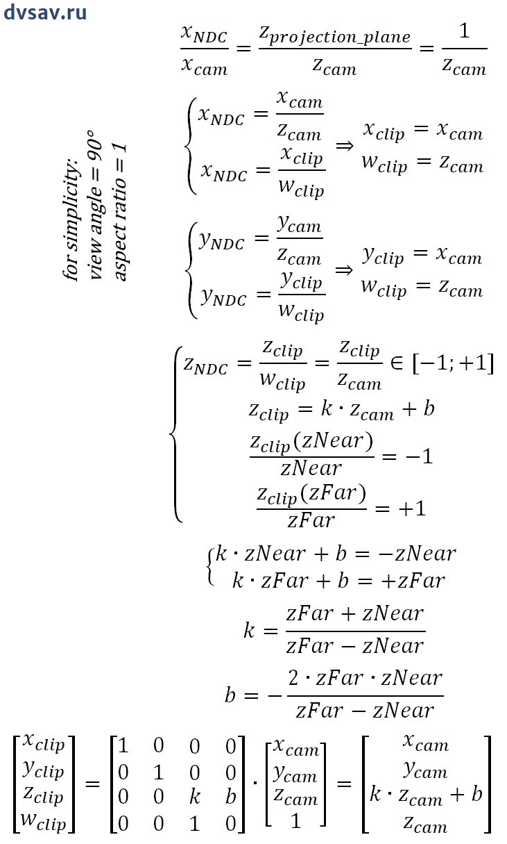 Теперь вычислим матрицу перспективной проекции. Для простоты возьмем угол обзора 90 градусов и соотношение сторон 1:1, как на рисунке 2. Вычисление матрицы показано на рис. 3. Из рисунка видно, что для того, чтобы спроецировать точку с координатами XY на плоскость проекции, надо разделить эти координаты XY на координату Z. Это деление производится автоматически (т. е. ее не нужно специально программировать) на этапе преобразования координат из clip space в NDC space. Только вот деление производится на координату W, поэтому надо сделать так, чтобы координата W стала равна координате Z, и поэтому в 4-й строке (W) и 3-ем столбце (Z) матрицы перспективной проекции (рис. 3) вы видите число 1. Что касается координат XY, то они остаются теми же самыми, поэтому в первых двух строках матрицы по диагонали у нас единицы.