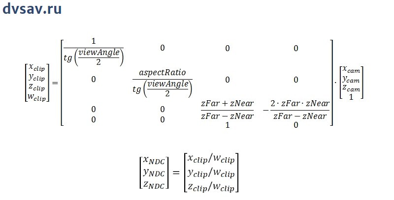 Второй плюс — четвертая координата позволяет свести преобразование перспективной проекции к двум операциям: умножение на матрицу (т. н. матрица перспективной проекции) и деление получившегося вектора на его четвертую координату W (perspective division). Подробности о перспективной проекции читайте ниже.