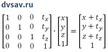Первый плюс — в том, что благодаря координате W теперь преобразование переноса (translation) может быть выражено при помощи умножения на матрицу (рис. 1). Имея три координаты, при помощи умножения на матрицу можно выразить преобразования поворота, масштабирования и сдвига, но нельзя выразить преобразование переноса. А хотелось бы иметь универсальный способ для осуществления любых преобразований, и однородные координаты предоставляют такую возможность.