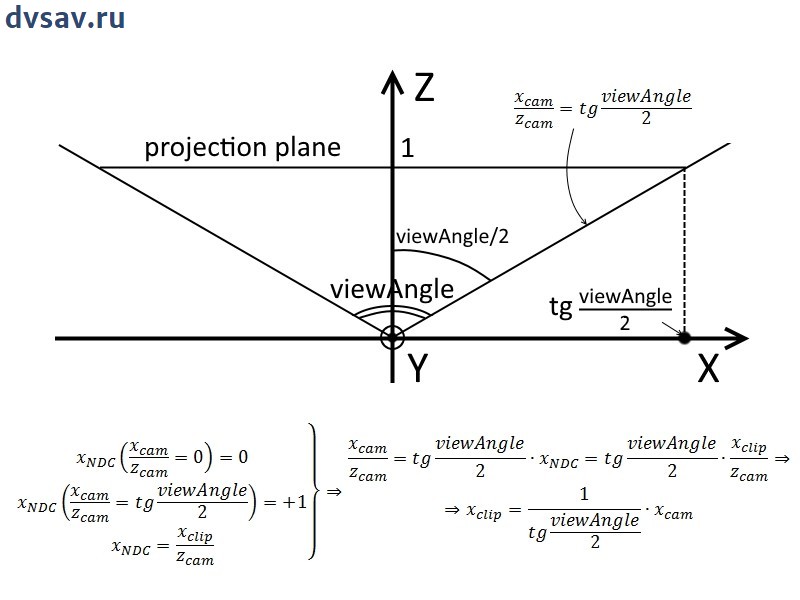 Итак, мы нашли матрицу перспективной проекции для случая угла обзора 90 градусов и для соотношения сторон 1:1. Теперь посмотрим, как влияет на нее угол обзора (рис. 4). Угол обзора — это угол нашей усеченной пирамиды в плоскости XZ. Он определяет насколько широкую панораму мы видим на экране. Крайние точки, лежащие на лучах этого угла превращаются в точки с X=+-1 в NDC space. Исходя из этого можно составить уравнение для элементов 1-й строки матрицы ПП (рис. 4).