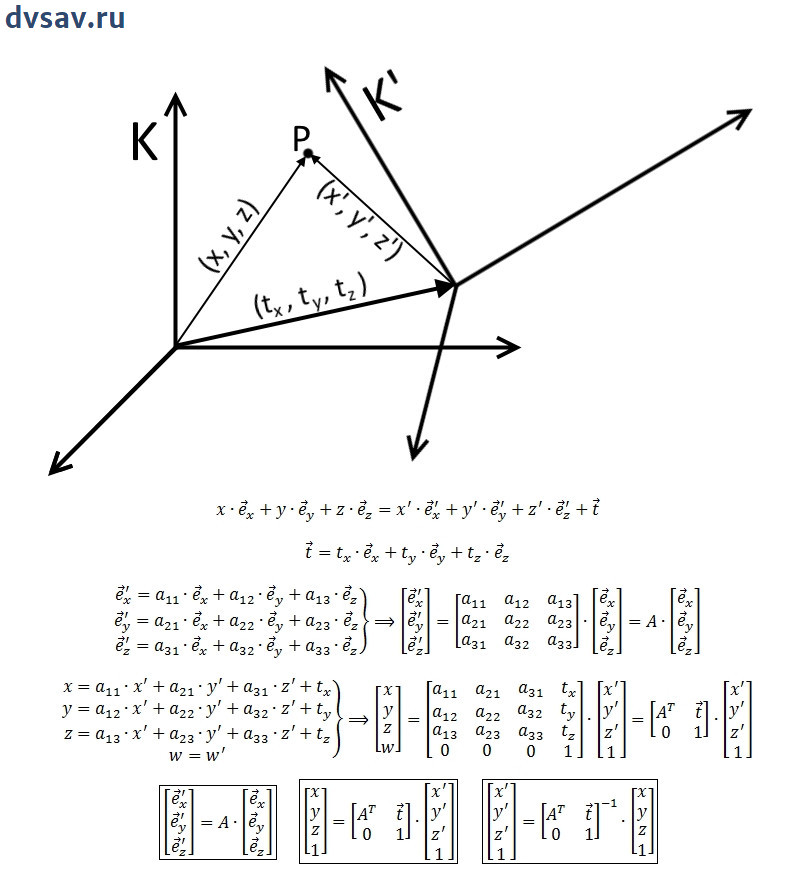Для начала поговорим переходе от одной системы координат к другой. В 3-хмерном евклидовом пространстве существует т. н. базис, который состоит из трех векторов. Базис — это набор векторов, такой, что любой вектор можно представить в виде линейной комбинации базисных векторов. Коэффициенты в этой линейной комбинации называются координатами. Пусть есть две системы координат K и K’. У одной будет один базис, у другой — другой. Кроме того, начало координат одной системы отлично от начала координат другой. Соответственно, одна и та же точка P в одной системе будет иметь одни координаты, а в другой — другие. Задача — найти преобразование (матрицу преобразования), которое переводит вектор из одной системы координат в другую. Вычисление матрицы перехода из одной системы в другую показано на рис. 1.