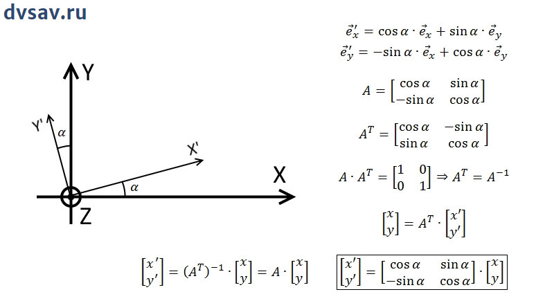Таким образом, найти матрицу преобразования координат из одной системы в другую можно, выразив базисные векторы целевой системы через базисные векторы исходной системы. Пример нахождения такой матрицы представлен ниже на рисунке 2. Это матрица поворота вокруг оси Z.