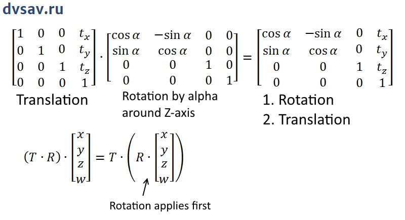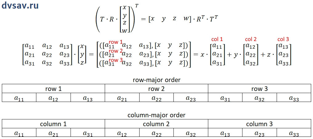 Я привык при умножении матрицы на вектор располагать матрицу слева, а вектор справа, поэтому первым к вектору применяется то преобразование, чья матрица расположена правее (это тоже показано на рис. 4). Если же при умножении располагать вектор слева, а матрицу справа, то по сравнению с предыдущим вариантом и матрица и вектор будут транспонированными, что показано в первой строке рисунка 5. Если вы транспонируете произведение двух матриц, то меняется порядок их расположения. При программировании или при записи математических выкладок обычно выбирают тот или иной вариант расположения векторов и матриц и затем строго следуют выбранному варианту. Я всегда выбираю вариант, когда вектор записывается в виде вертикального столбца.