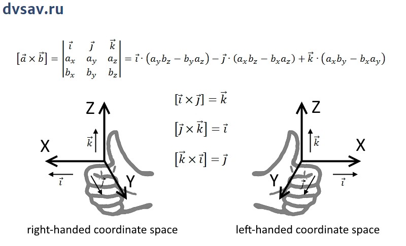 Векторное произведение — это вектор, который направлен перпендикулярно перемножаемым векторам. Но таких направлений два. В свое время на уроках физики меня учили, что направление векторного произведения определяется «правилом правого винта», оно же «правило буравчика», оно же «правило правой руки». Но оказывается, направление векторного произведения зависит от ориентации осей системы координат… Или не даже не от системы координат, а от ориентации (handedness) пространства, под коей понимается выбор нами тройки векторов и объявления ее «правой». В общем, я буду считать, что выбранная нами ориентация пространства совпадает с ориентацией выбранной системы координат. Итак, если координатные оси образуют правовинтовую систему (рис. 6), то направление векторного произведения определяется правилом правой руки, если левовинтовую — то правилом левой руки (вот это-то и оказалось для меня новостью). Практически это означает, что если у вас есть world space и model space, и если вам известны направления двух осей model space относительно world space (т. е. вам известны координаты двух ортов model space и эти координаты заданы в координатной системе world space), то направление третьей оси можно посчитать, используя формулу на рис. 6. Причем ориентация (handedness) получившихся трех осей model space будет совпадать с ориентацией координатных осей world space.