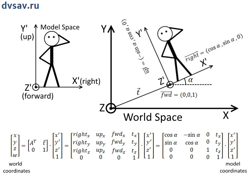 Каждая модель, как уже говорилось в предыдущей заметке, создается в с своем координатном пространстве — пространстве модели — model space. Наша задача — поместить модель в мир (world space), где она будет перемещаться и вращаться (см. рис. 3). Т. е. зная координаты вершин модели в model space, найти их значения в world space. Как задается позиция модели в world space? — При помощи вектора в world space (на рис. 3 это вектор t). Как задается ориентация модели в world space? — При помощи трех векторов: forward, right и up, которые обычно совпадают с координатными осями model space — Z, X и Y соответственно. Нам должны быть известны координаты этих трех векторов в world space. Иными словами, мы знаем, как ориентированы координатные оси model space по отношению к world space. Тогда матрица, которая переводит вершины модели из model space в world space, находится легко.