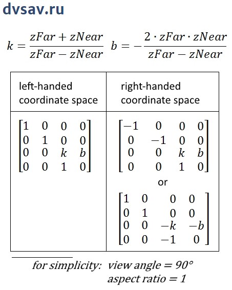 Далее мне стало интересно, изменились ли бы какие-то функции моего API, если бы я выбрал не левую, а правую систему координат world space. И я нашел одно изменение — должна была бы измениться матрица перспективной проекции — на рисунке 7 показано, как именно. Ну и еще изменились бы настройки depth test.