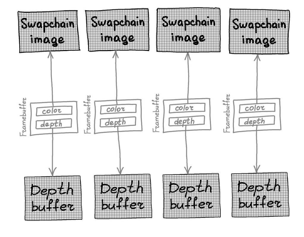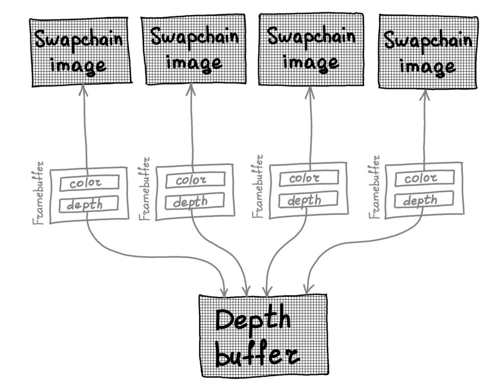 Итак, мы имеем Swapchain, состоящий из нескольких буферов цвета. Сколько нам потребуется буферов глубины? Столько же, сколько изображений у нас в свопчейне — потому, что каждое из этих изображений мы отрисовываем в общем случае параллельно, и в этой отрисовке задействован буфер глубины, в который в ходе отрисовки производится и чтение, и запись. Если у вас потенциально есть N параллельных потоков (в GPU), которые пишут и читают буфер глубины, то лучше бы вам иметь N отдельных буферов глубины. Сказанное относится не только к буферу глубины, но и к любым ресурсам (буфер цвета, uniform buffer), которые не являются read-only.