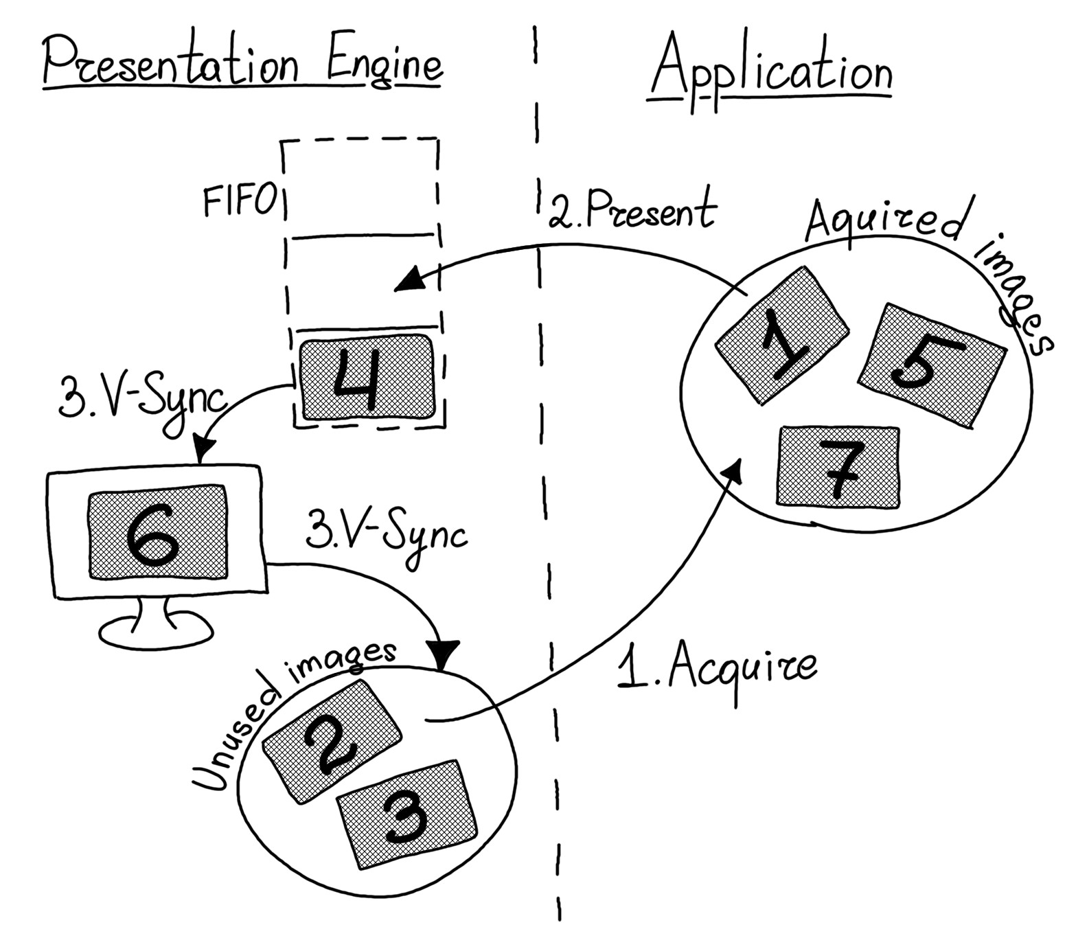Swapchain представляет собой набор изображений или, другими словами, буферов цвета (color buffers), а также метод (presentation mode), при помощи которого эти изображения крутятся на «карусели». Методов этих существует несколько, о них хорошо написал в своей брошюре Pavel Lapinski. Наиболее практичными являются два метода: FIFO и MAILBOX. Причем, только FIFO гарантированно поддерживается во всех реализациях Vulkan, но MAILBOX предпочтительнее, если только он поддерживается. На рис. 1 показан метод FIFO. MAILBOX очень похож, поэтому я не стал его рисовать.