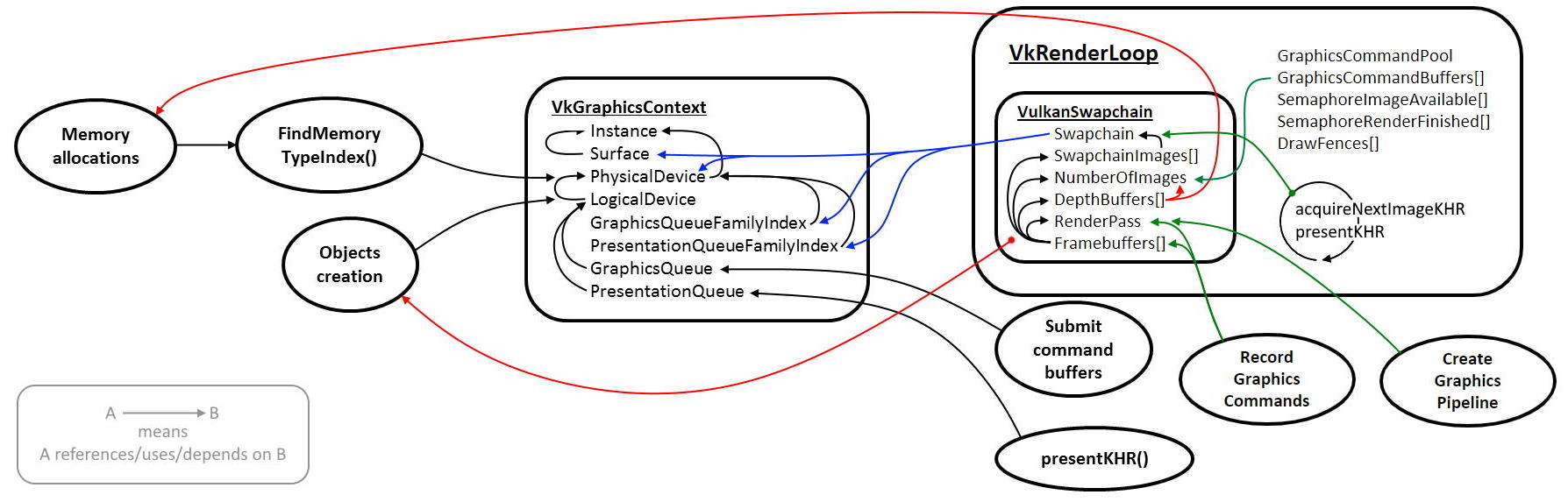 Как обычно, в конце привожу рисунок взаимозависимостей между изученными нами на данный момент объектами Vulkan: