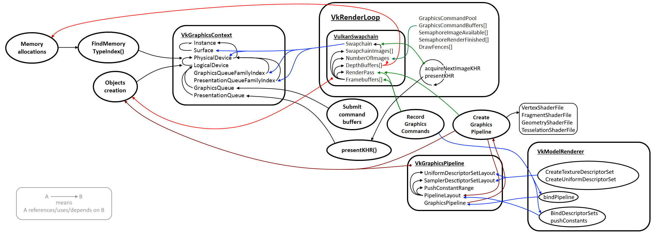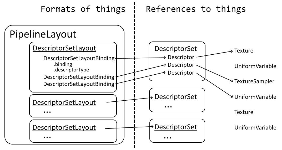 Каждая переменная (uniform variable) содержится в некоем буфере памяти. Ссылка на этот буфер помещается в Descriptor этой переменной. Несколько переменных группируются в набор под названием DescriptorSet. DescriptorSet прикручивается к Pipeline’у динамически в ходе записи команд в командный буфер (функция vkCmdBindDescriptorSets). Все ресурсы (переменные, текстуры, сэмплеры), которые ожидает наш Pipeline, могут находиться в одном DesctorSet’е или могут быть разбиты на несколько DescriptorSet’ов. В структуре PipelineLayout, которая используется при создании пайплайна, мы указываем, сколько и какие ресурсы ожидает наш пайплайн. PipelineLayout содержит массив структур DescriptorSetLayout, в каждой из которых описывается формат одного из DescriptorSet’ов, который может быть прикручен к пайплайну. DescriptorSetLayout содержит массив структур DescriptorSetLayoutBinding, в которой указан индекс binding соответствующего ресурса (он указан в шейдере) и тип ресурса (переменная, текстура, сэмплер и пр.). Каждая из структур DescriptorSetLayoutBinding соответствует, как нетрудно догадаться, ровно одному Descriptor’у. Итак, все эти Layout’ы задают формат входной информации и указываются при создании Pipeline’а, а DescriptorSet’ы (и Descriptor’ы соответственно), которые должны соответствовать этому формату, прикручиваются к пайплайну динамически в ходе записи команд в командный буфер. Ниже покажем код для создания неких гипотетических Layout’ов:
