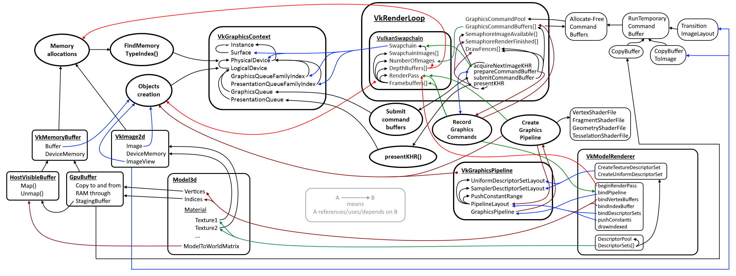 Итак, нам осталось рассмотреть привязку данных наших трехмерных объектов (mesh, uniform variables, textures etc.) к пайплайну. Делается это при помощи различных команд, которые записываются в командный буфер. Начнем рассмотрение записи команд в буфер с некоего базового скелета: