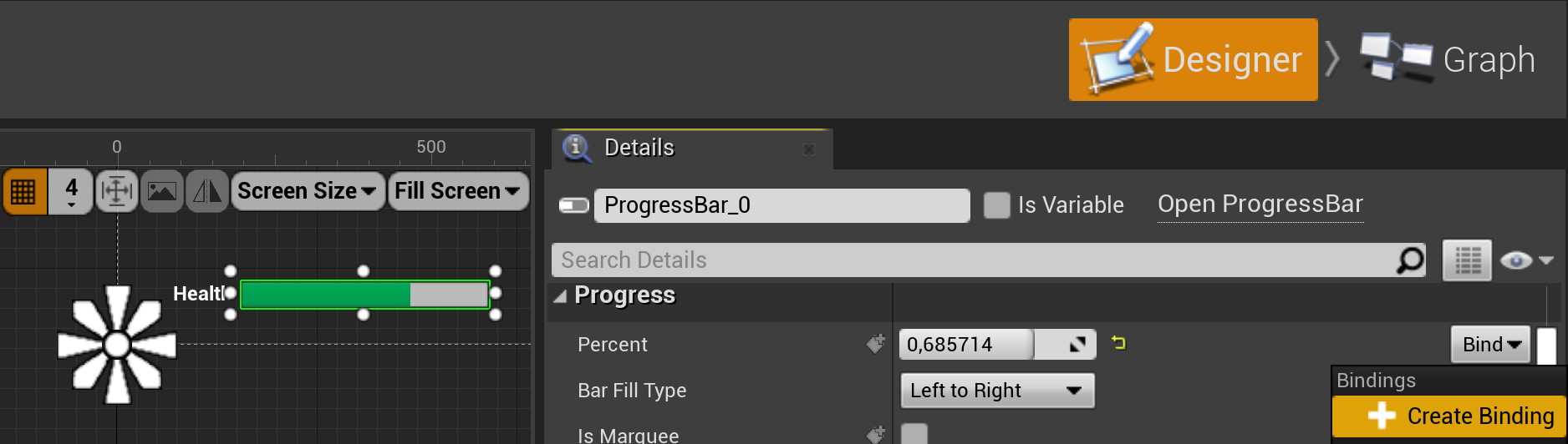 Можно сделать так, чтобы значение содержимого (или иного свойства, цвета например) элемента управления вычислялось в каждом кадре (в каждом Tick’е). Яркий пример — шкала здоровья (Progress Bar). Правильно будет, ели значение, отображаемое в шкале здоровья обновлялось в каждом кадре. Поэтому должна существовать функция-член нашего блюпринта (назовем ее GetHealth), которая будет вызываться в каждом кадре. Этот механизм называется Binding (снова напоминает мне Windows Presentation Foundation). Чтобы задействовать binding, на примере Progress Bar, нужно выбрать Progress Bar, затем Details > Progress > Percent > Bind > Create Binding (рис. 7) — автоматически будет создана функция-член и вы переместитесь в редактор Graph для написания ее кода.