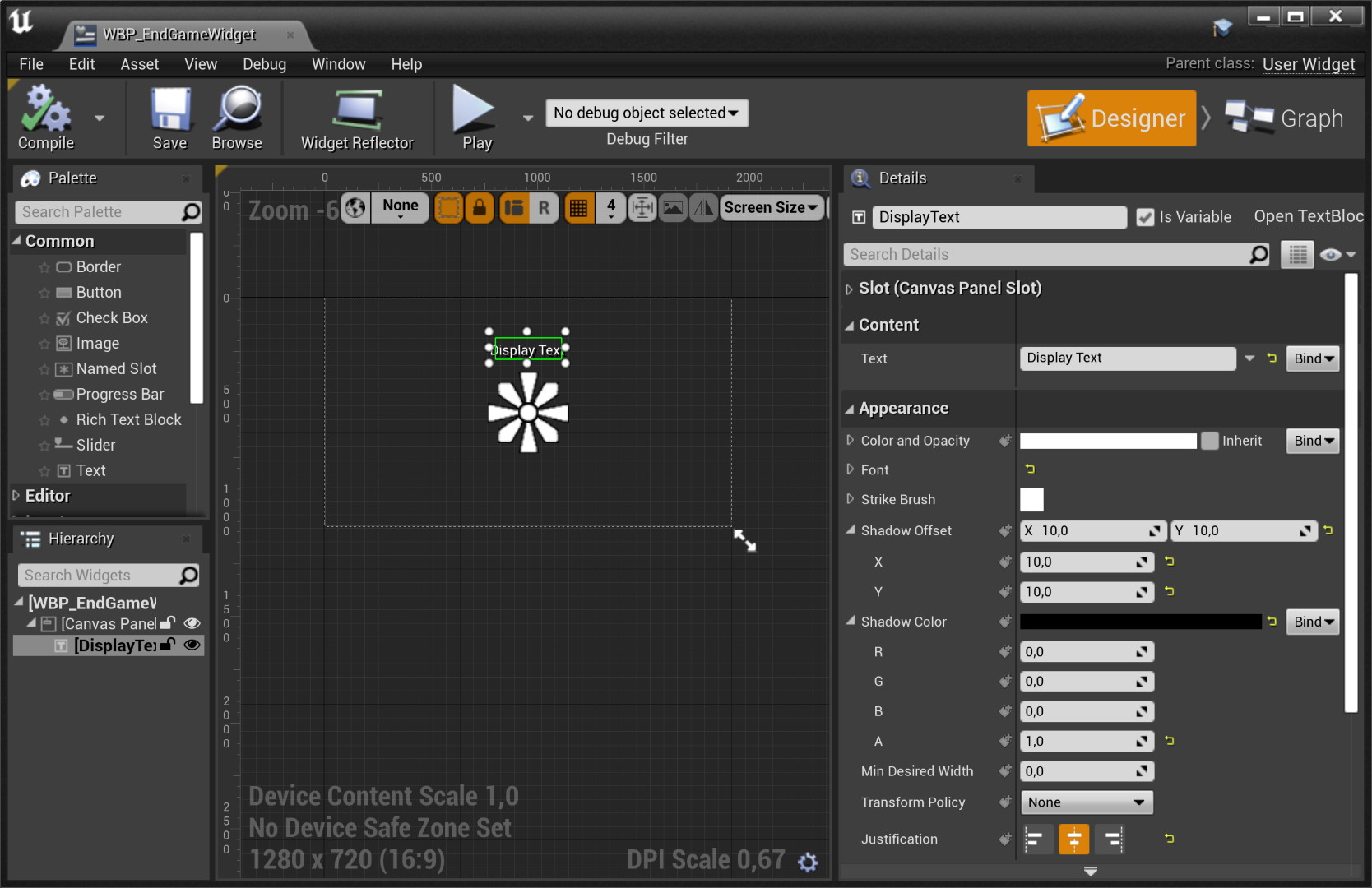 По-умолчанию верхним элементом в иерархии является Canvas Panel. Можно например перетащить элемент управления на Canvas Panel, и он станет его дочерним элементом. Выбрав элемент управления, мы можем изменять различные его свойства в окне Details, некоторые из которых отвечают за внешний вид элемента, а другие — за позицию элемента внутри его родительского элемента управления (контейнера). Позиция элемента внутри Canvas Pane задается относительно Anchor’а («якоря»), который может быть выбран из выпадающего списка в меню Details > Slot (Canvas Panel Slot) > Anchors. Позиция относительно anchor’а задается свойствами Details > Slot (Canvas Panel Slot) > Position X|Y, Size X|Y, Alignment X|Y. Например, чтобы разместить элемент управления ровно по центру Canvas Pane, нужно задать Anchors=ПоЦентру, Position X=0, Position Y=0, Alignment X=0.5, Alignment . Также полезна галочка Size To Content, которая подгоняет размеры рамки элемента управления в соответствии с содержимым элемента.